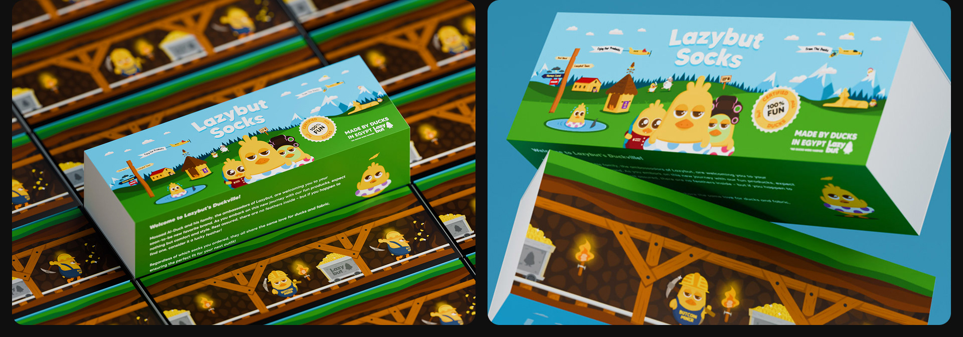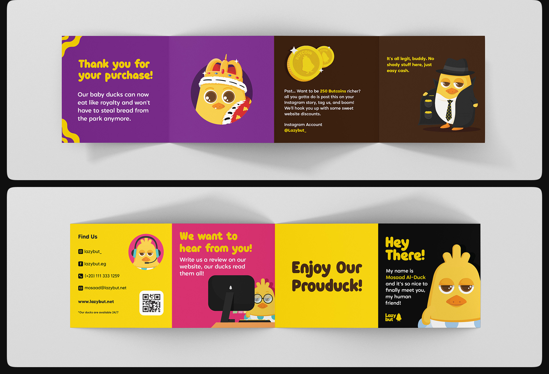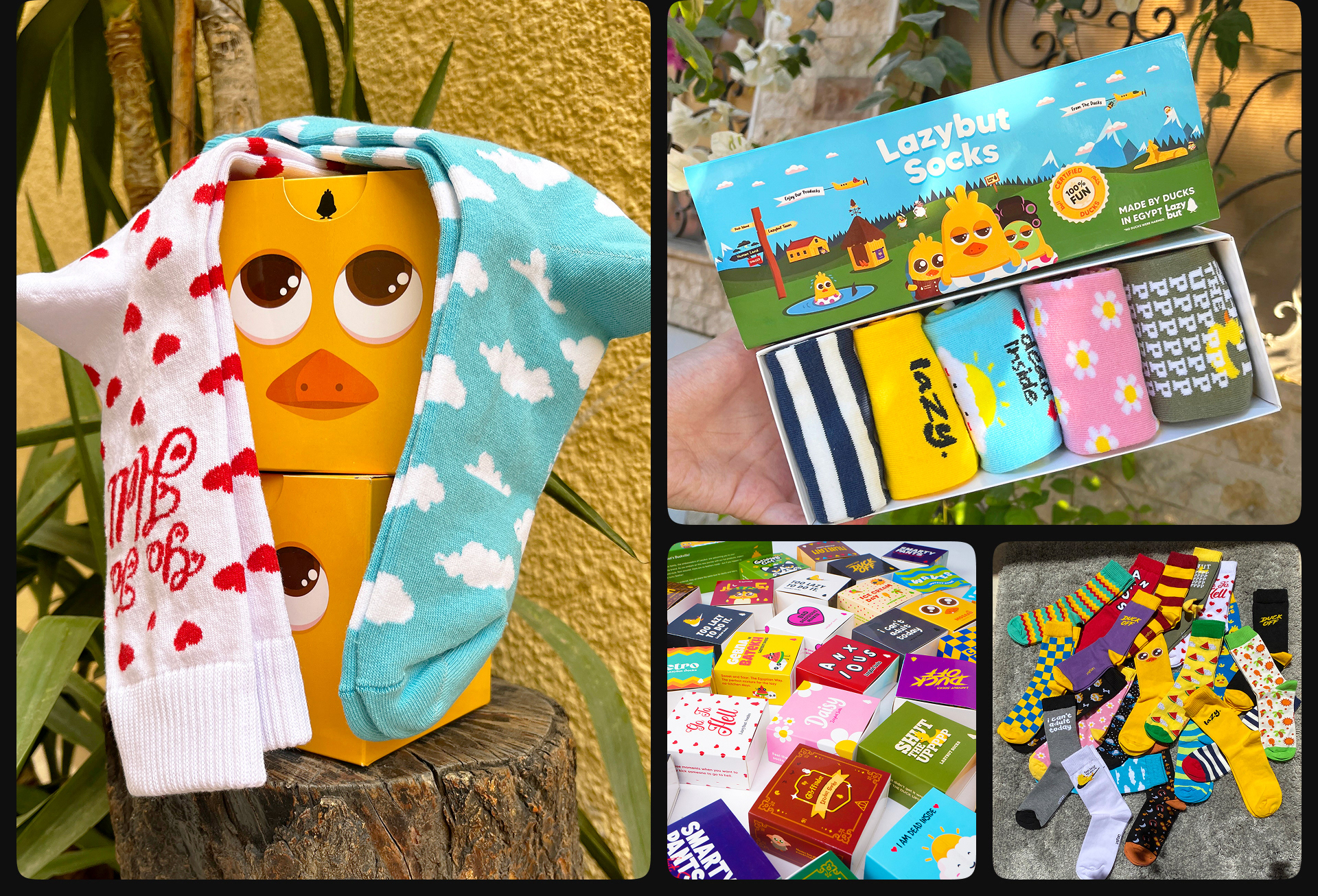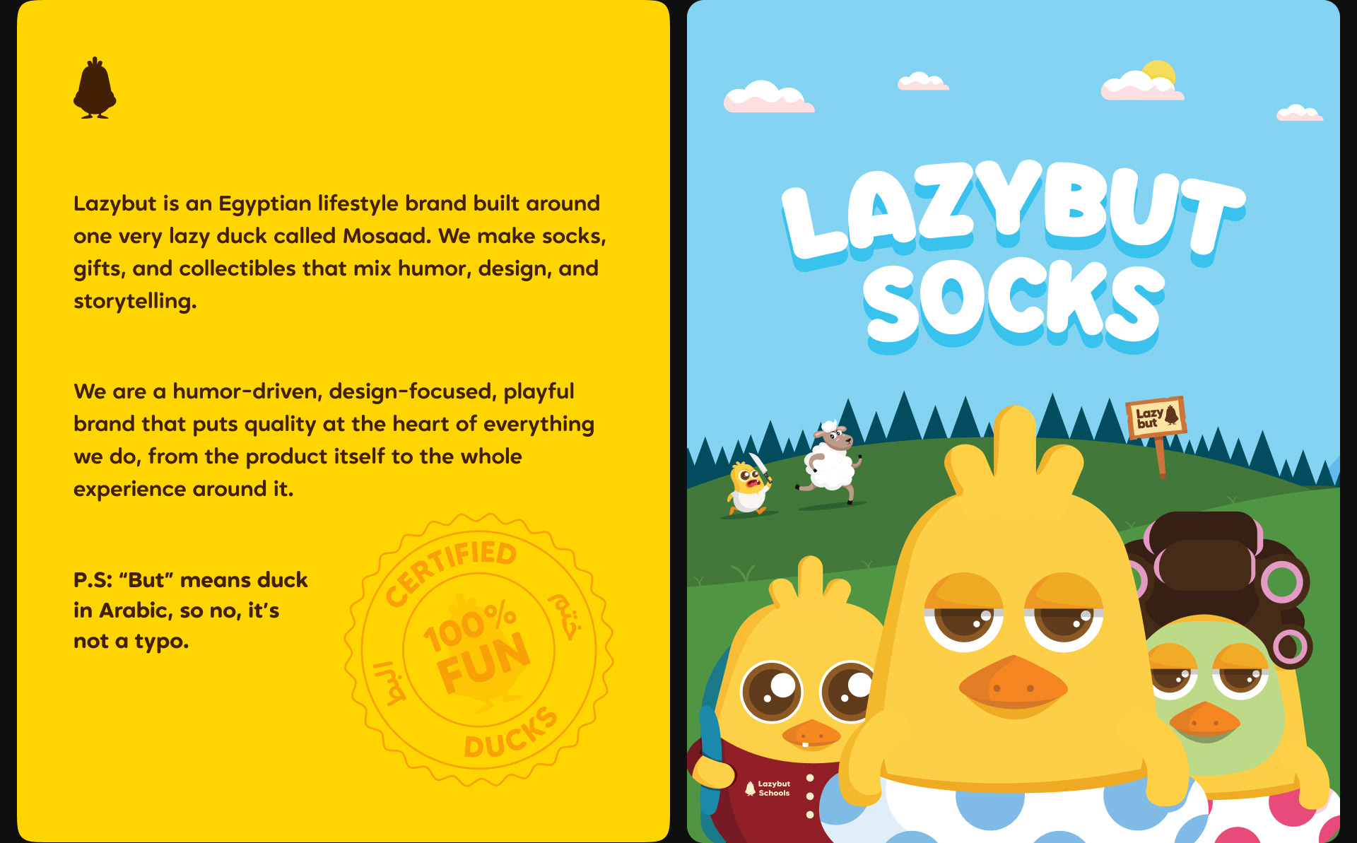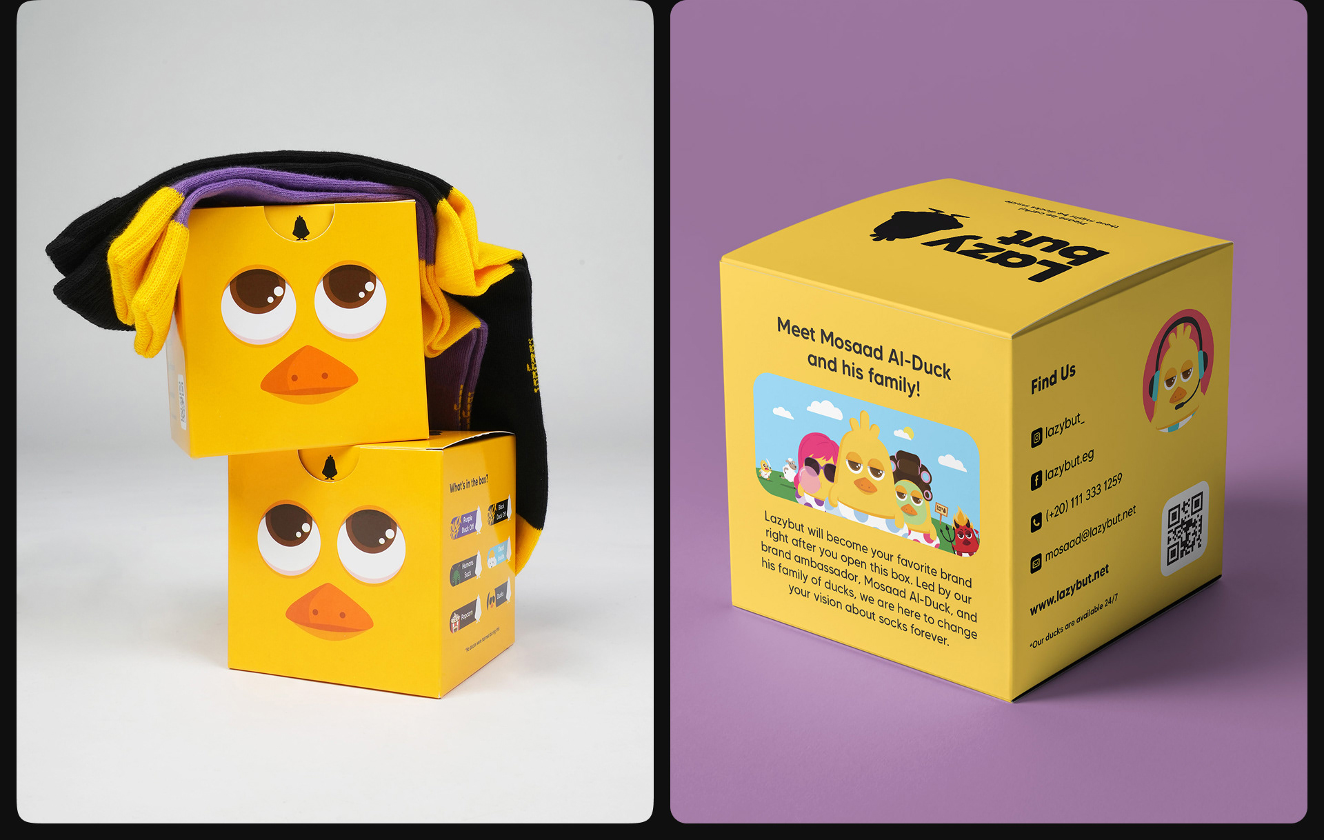 Lazybut is a fashion brand based in Egypt and was established in 2019. It began by designing trendy socks and stylish packaging. The brand has since expanded its produck range to include more different producks, most featuring their iconic character, Mosaad Al-Duck!